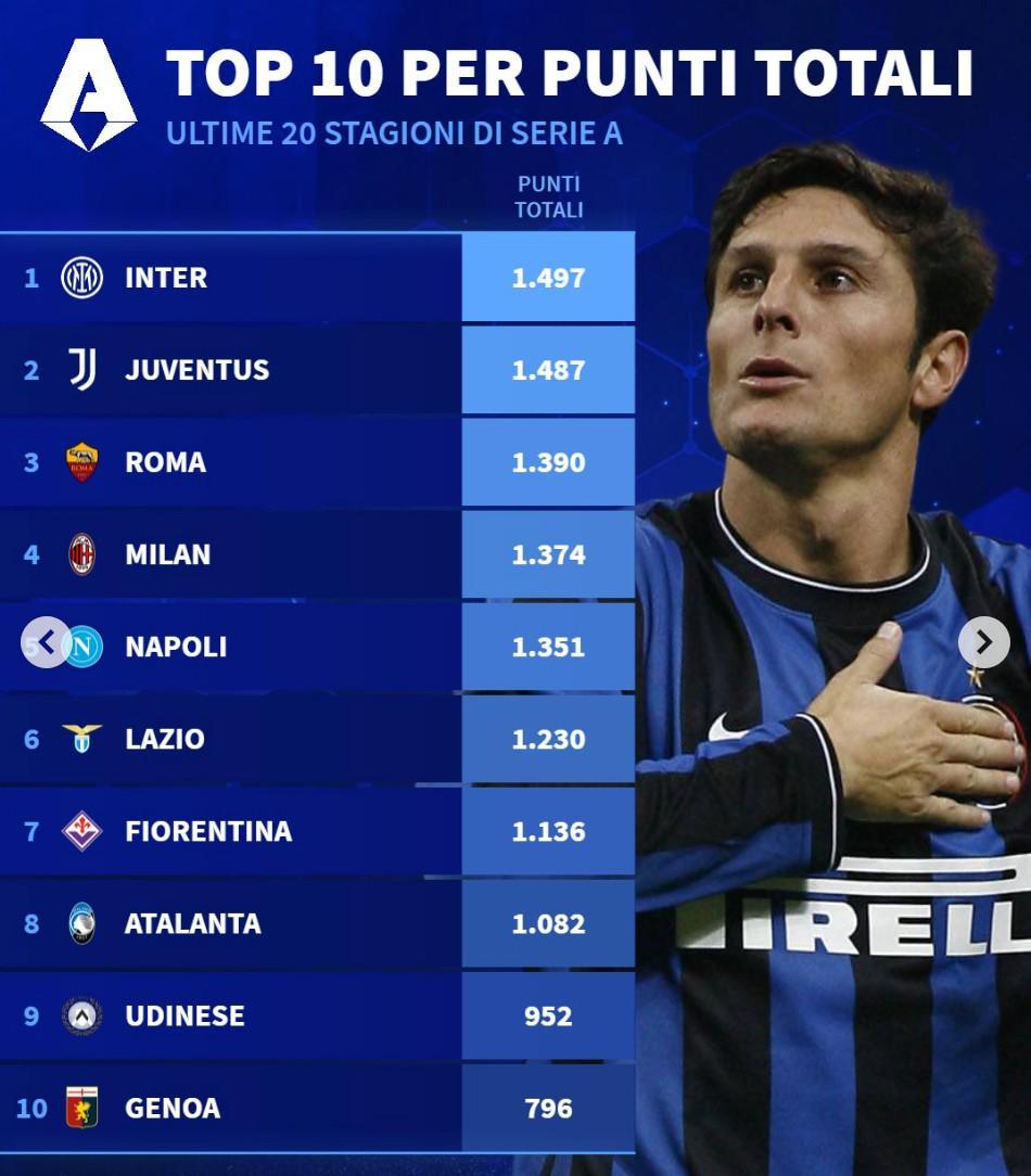 北京时间4月9日,德转统计出了意甲近20年场均积分和总积分排名前10的球队,尤文图斯和国际米兰分别在两份榜单中位居第1。